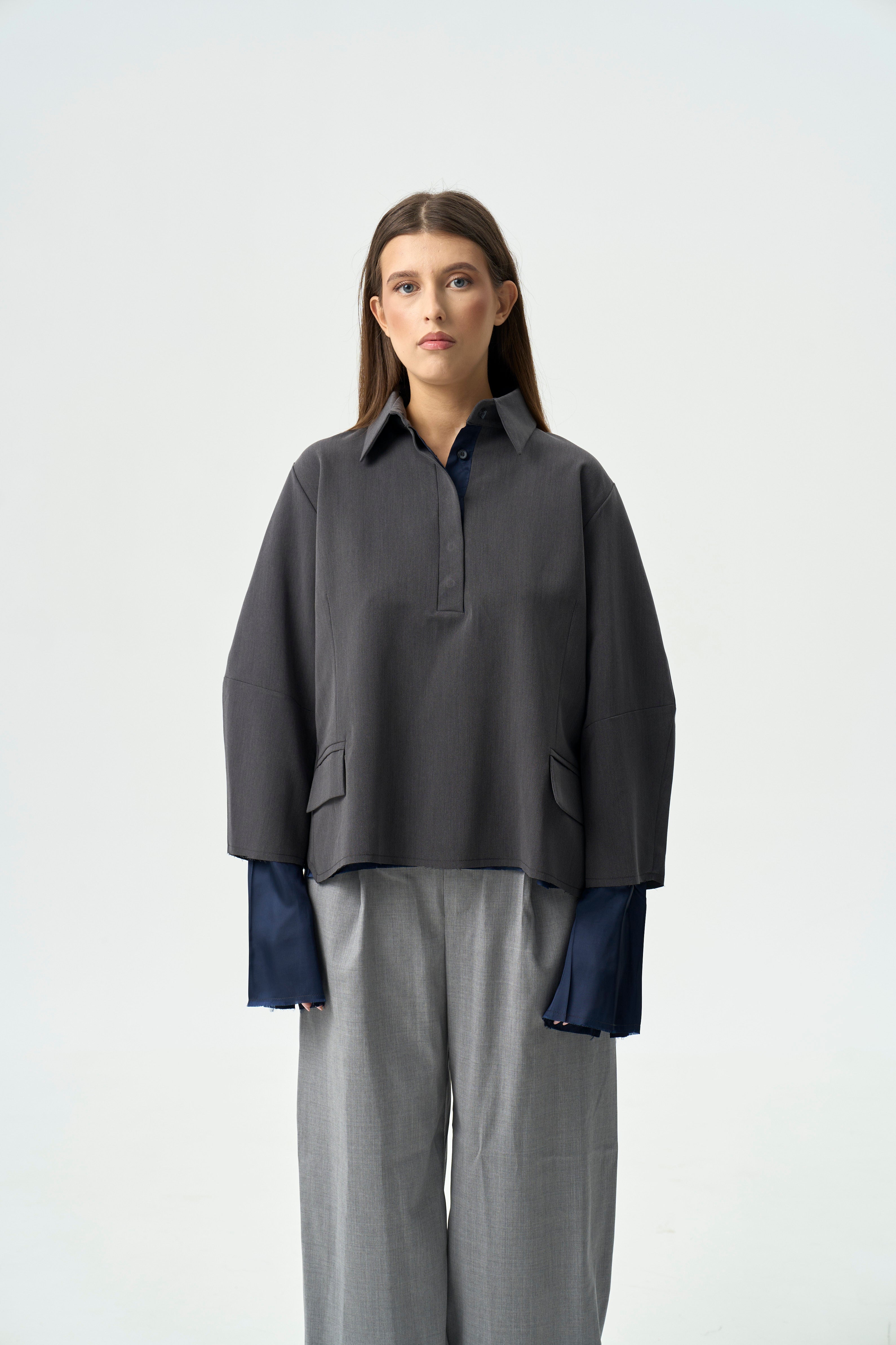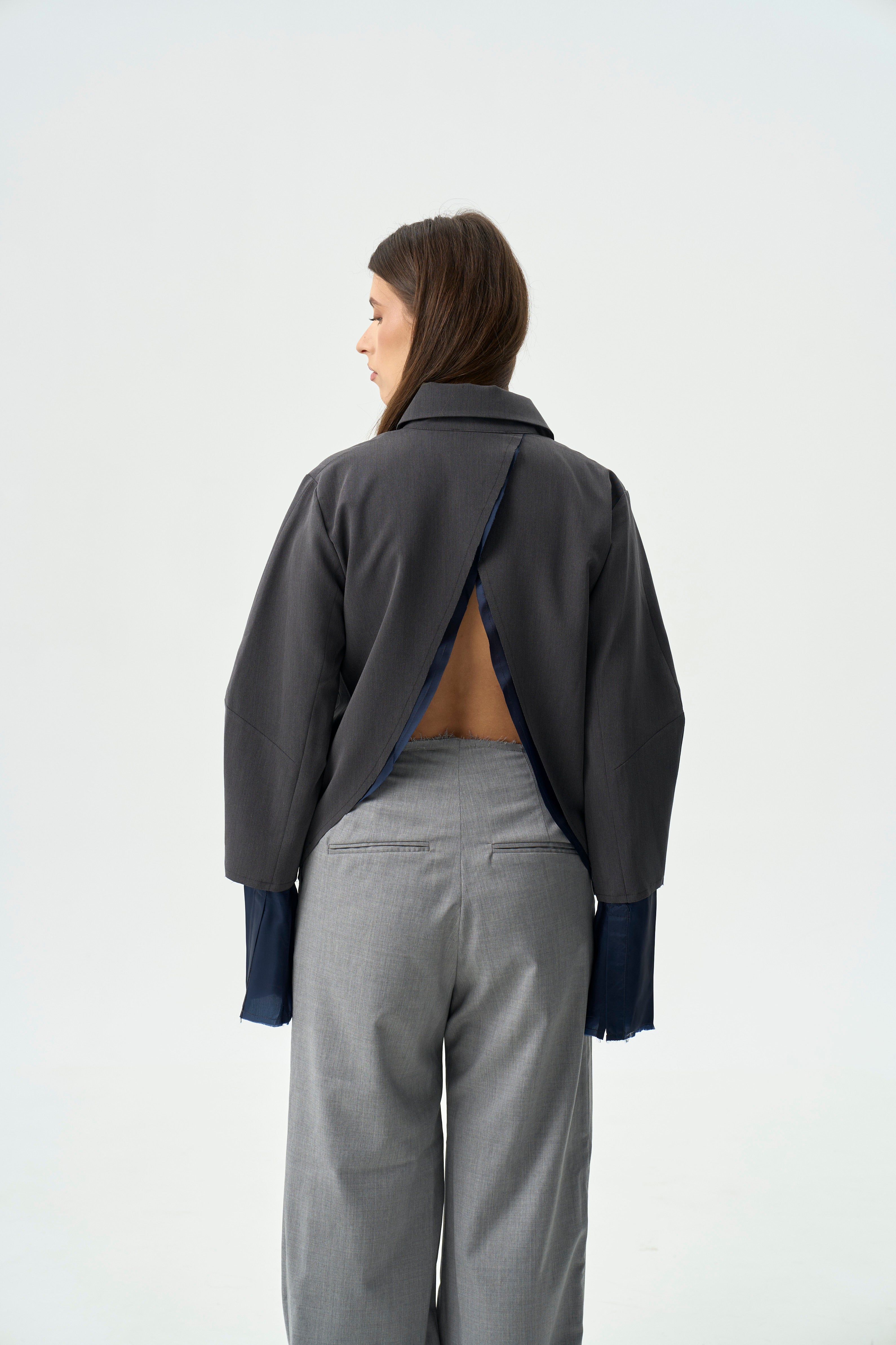 A standout design with contrasting fabric fluidity. Front welt pockets with flaps create a utilitarian feel, while overlapping back layers add movement and subtle softness. Balances strength with quiet rebellion.
