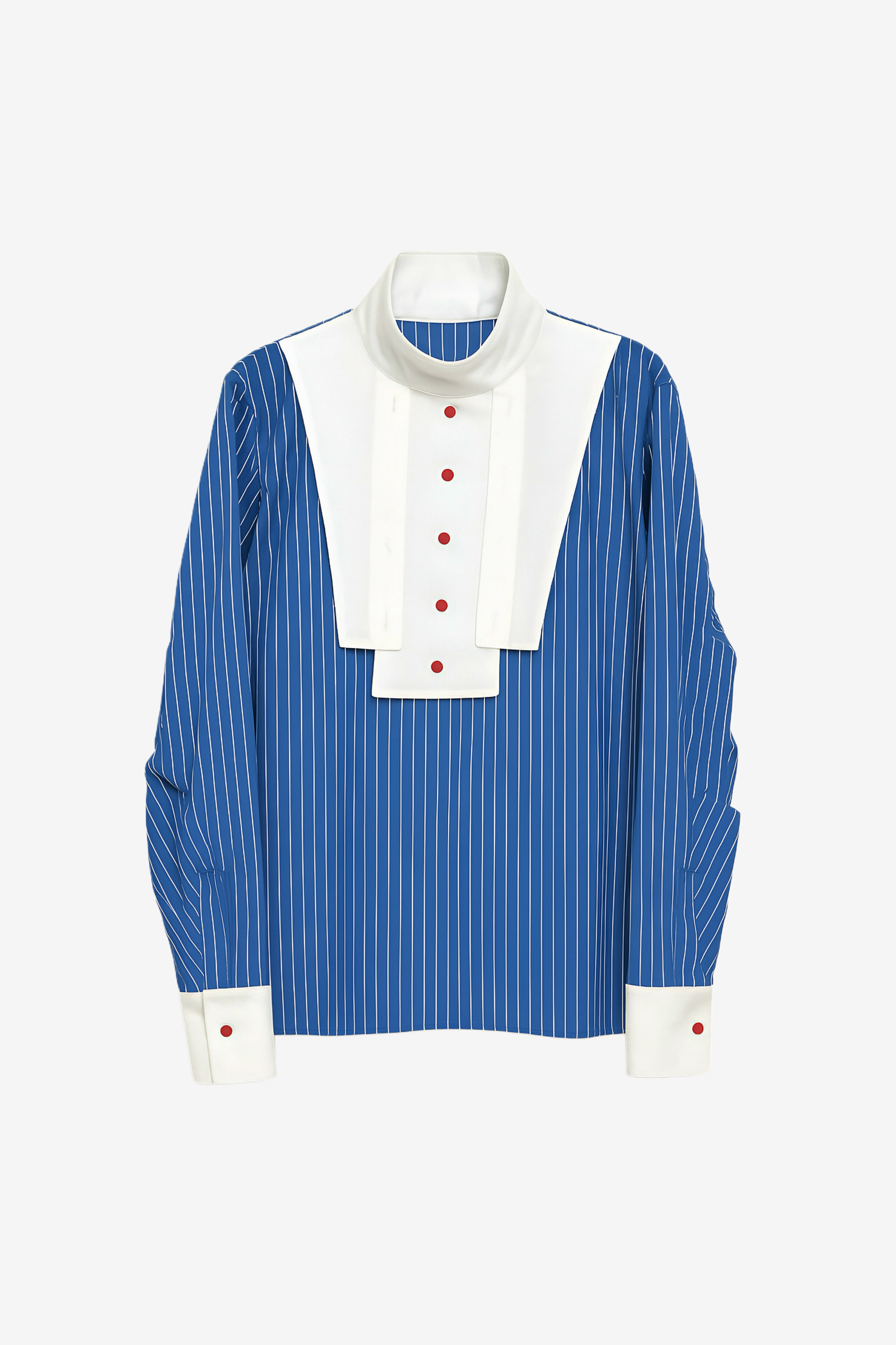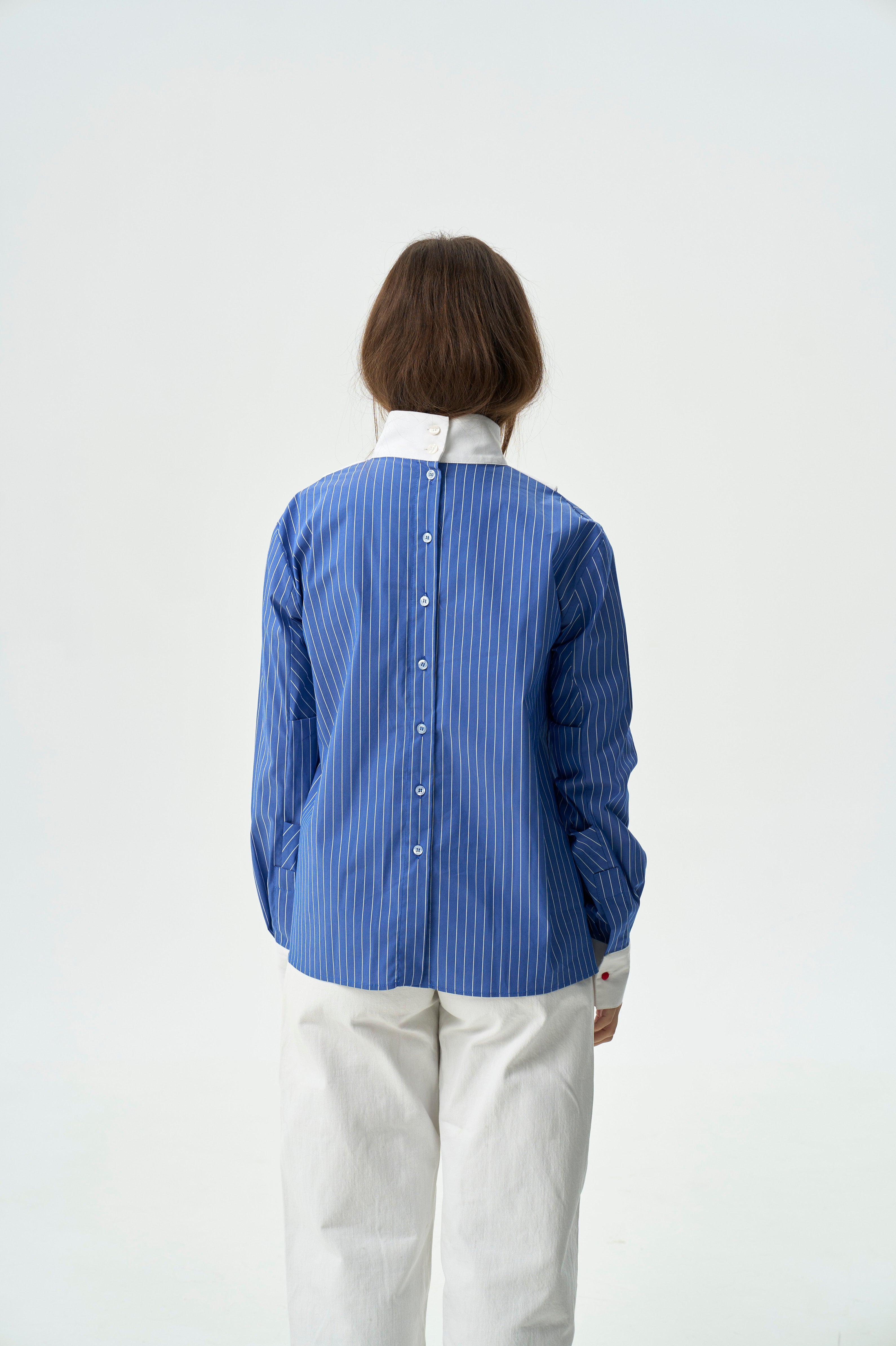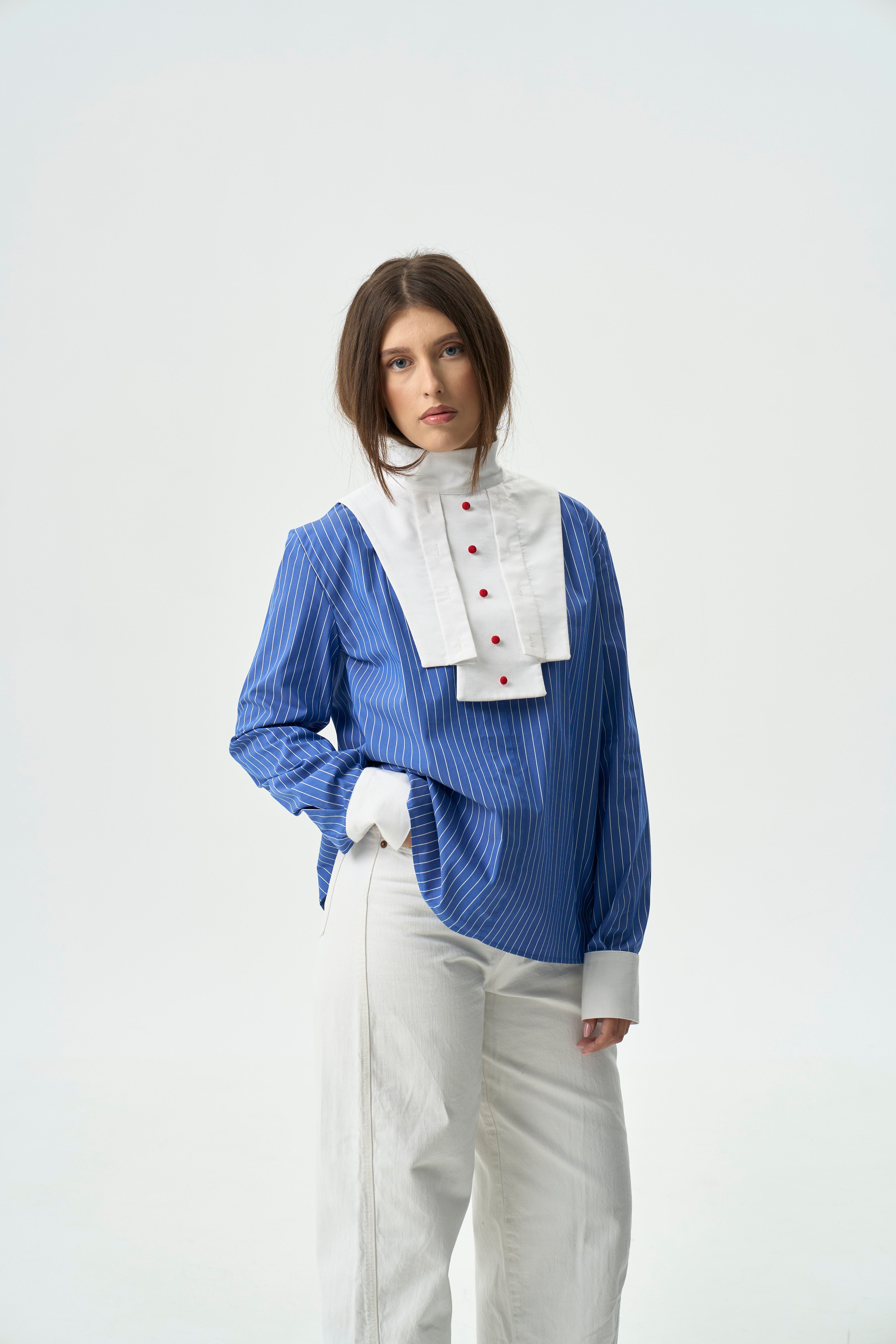 A conceptual approach to the striped shirt. The front panel is layered with multiple classic plackets, accented by bold red fabric-covered buttons. A balance of softness and structured elegance.